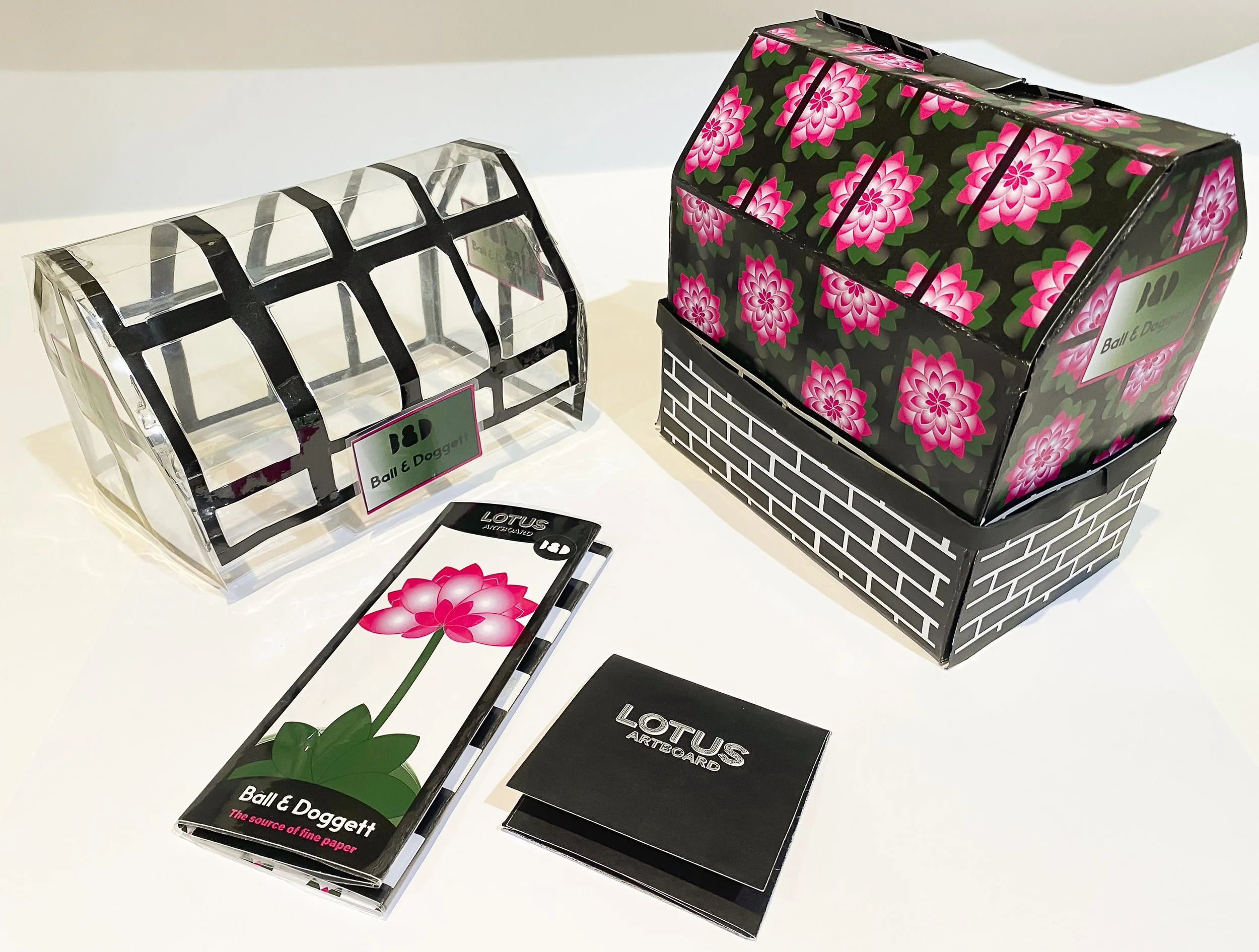 I selected my Ball and Doggett paper swatch sample, Lotus (Art Board), inspired by a watercolor painting I created of a pink lotus. My concept was to design a package that embodies the rarity and sacredness of the lotus. Since the lotus is a plant, I aimed to create packaging reminiscent of an actual lotus flower, leading me to the idea of a greenhouse design.